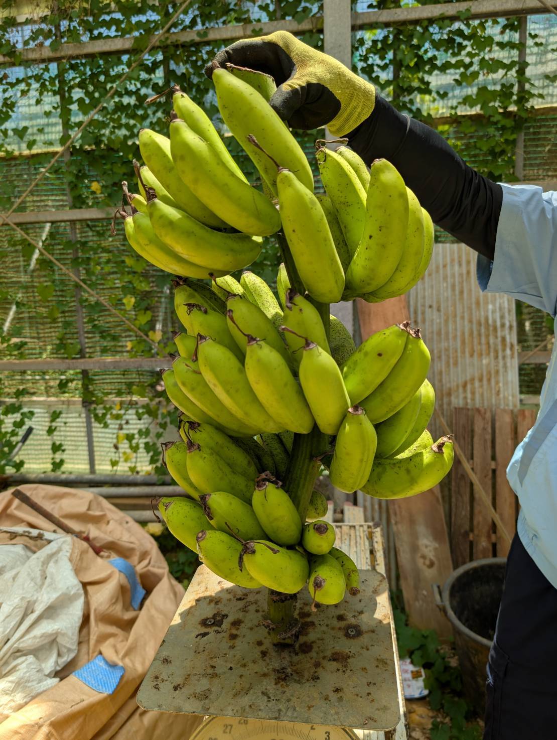 市場の流通量1%未満、希少性の高い島バナナ。市場に出回る品種、キャベンディッシュ、グロスミシェル種とは異なる小笠原諸島から伝わった在来種です。栽培がとても難しく、台風や病気のリスクが高く市場では、出回らない希少性の高い最高級フルーツです。